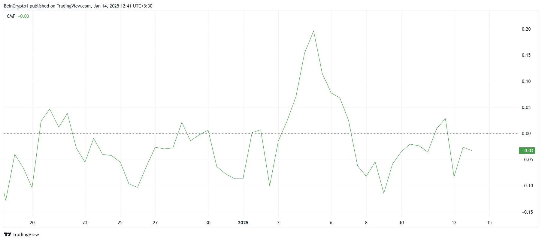 Til tross for nylige prisøkninger, forblir Chaikin Money Flow (CMF) indikatoren for HYPE under null-linjen. Dette reflekterer svake innstrømninger, noe som antyder at selv om markedet begynner å stabilisere seg, mangler det fortsatt betydelig investorengasjement. Sterkere innstrømninger er nødvendige for vedvarende prisvekst.