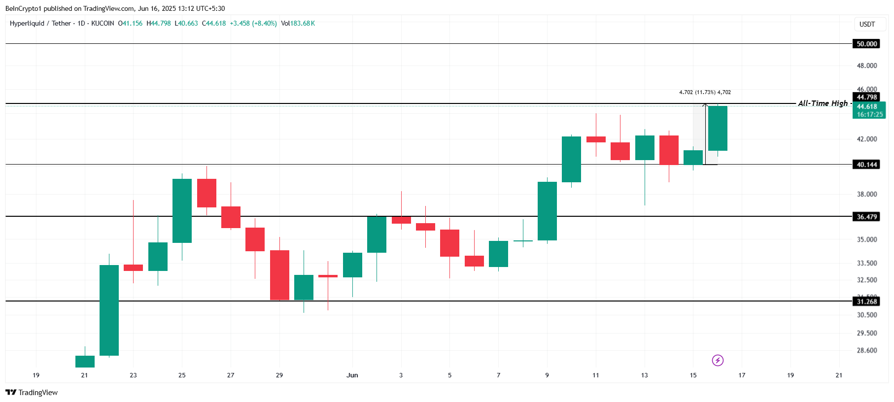 HYPE handles for øyeblikket til $ 44,61, etter en ny all-time high (ATH) på $ 44,79 under dagens intra-dag sesjon. Dette markerer en imponerende økning på 11,7 % de siste 24 timene.