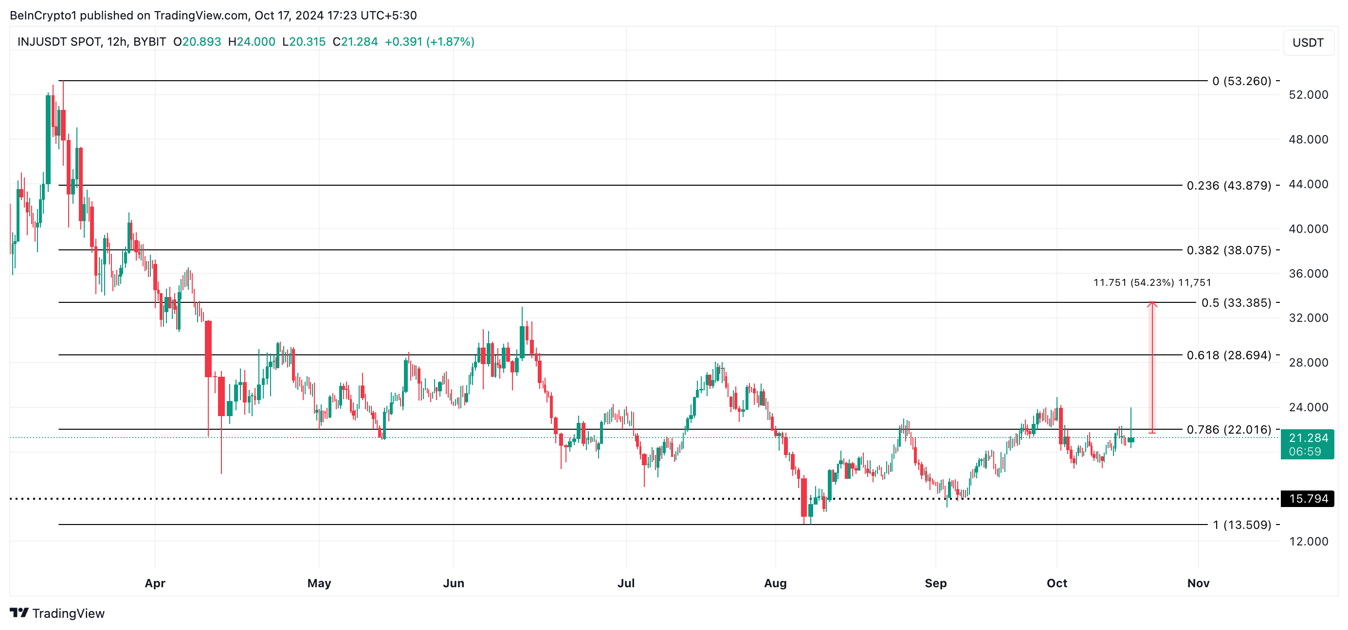 Nivået på $ 22,01 fungerer som en nøkkelmotstand for INJ, med mynten som for øyeblikket handles til $ 21,28, rett under dette merket. Hvis bullish momentum vedvarer, kan et brudd over denne motstanden utløse en 54 % rally, potensielt dytte prisen til $ 33,38 — et nivå sist sett i juni.