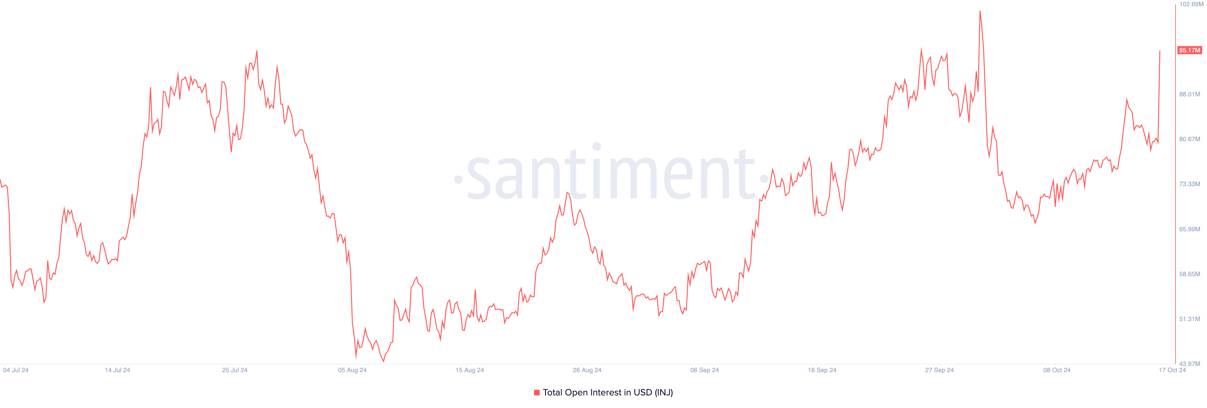 Videre har INJs åpne interesse økt med 19 % de siste 24 timene, noe som reflekterer økningen i markedets aktivitet. I skrivende stund står dette på $ 95,17 millioner.