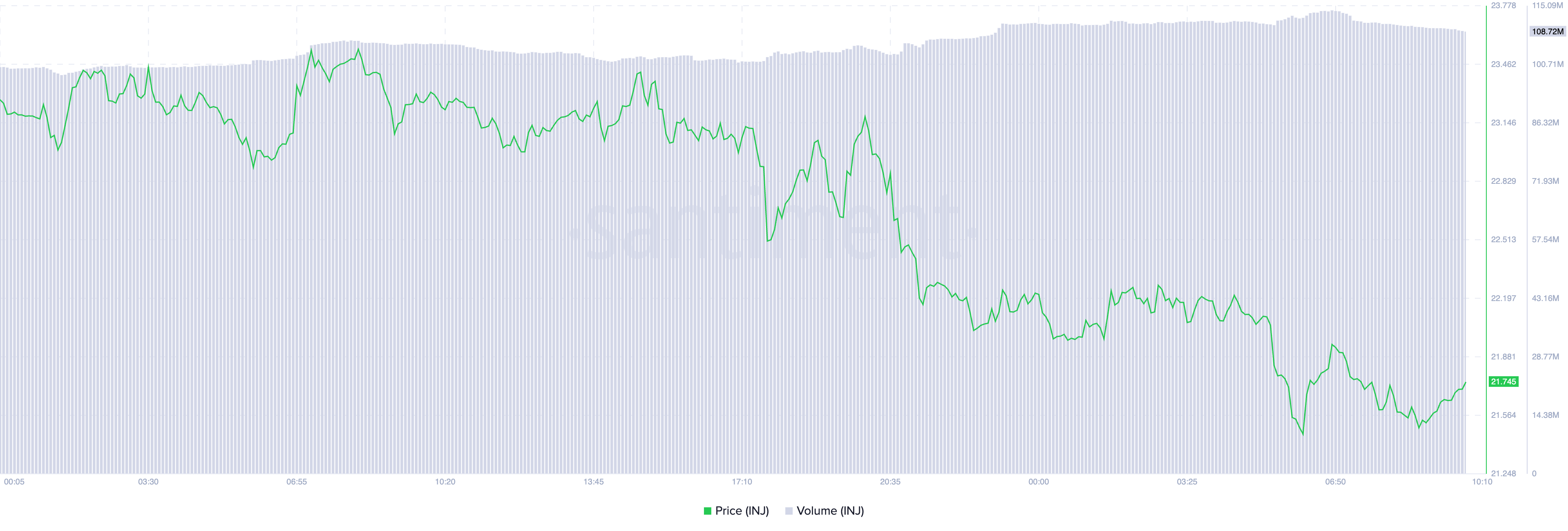 Selv om oppgraderingen er mindre enn 24 timer unna og lover å introdusere og forbedre flere kjernefunksjoner, har INJ sin pris ikke reagert positivt. Faktisk har myntens pris falt med 6 % i løpet av de siste 24 timene. Imidlertid økte dens daglige handelsvolum med 3 % i løpet av den perioden, noe som skaper en negativ volum-pris divergens.