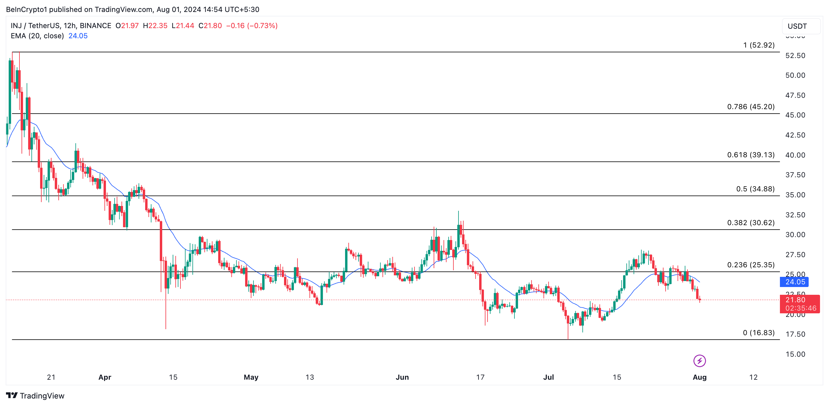 INJ sine prisbevegelser, vurdert på et 12-timers diagram, viser at den handles under sitt 20-dagers eksponentielle glidende gjennomsnitt (EMA), som måler gjennomsnittsprisen over de siste 20 handelsdagene.