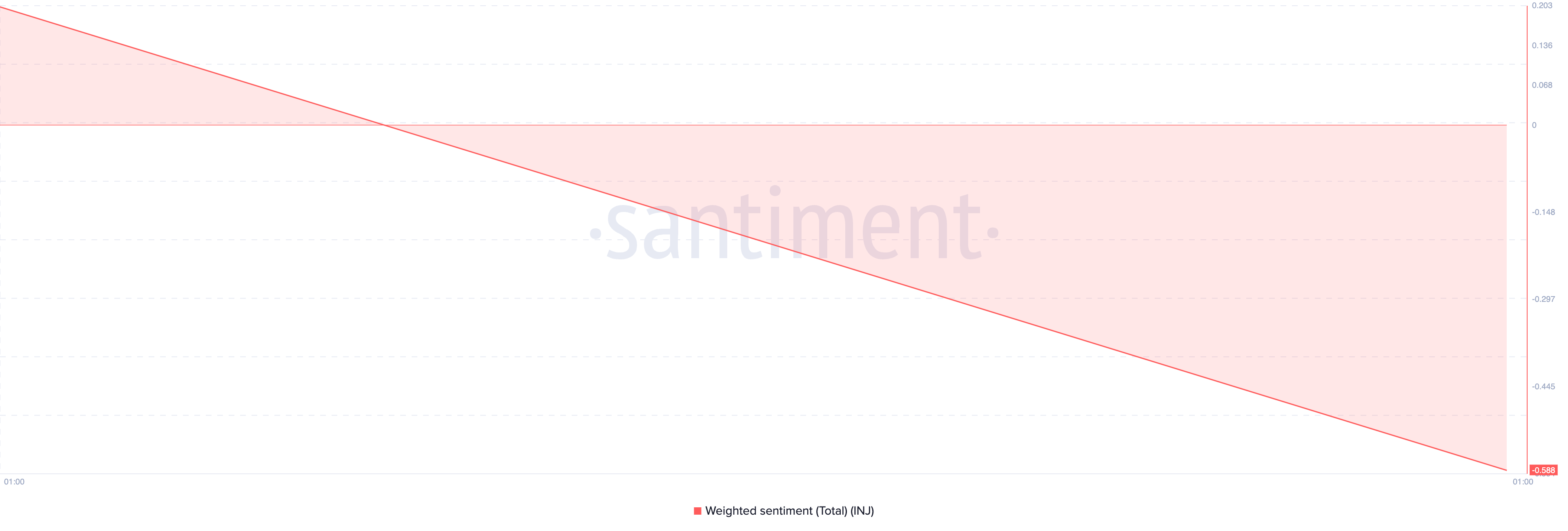 Videre snudde INJ sin vektede sentiment fra positiv til negativ i løpet av de tidlige handelstimene på torsdag, noe som fremhever økningen i bearish bias mot altcoinen. I skrivende stund er INJ sin vektede sentiment under nullinjen på -0,58.