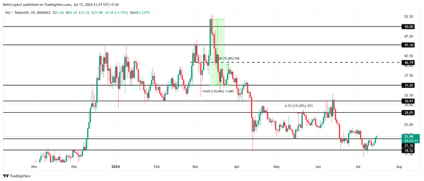 Injectives pris nærmer seg $22 har snudd motstanden på $21 til støtte og viser en potensiell økning fremover. Imidlertid kan denne stigningen motvirkes av bearishness fra hvalene, noe som resulterer i sidelengs bevegelse.
