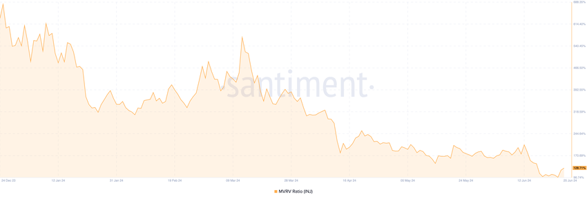 INJs forhold mellom markedsverdi og realisert verdi (MVRV) bekreftet at mynten kan være overvurdert. I skrivende stund er metrikkens verdi 128.71%.