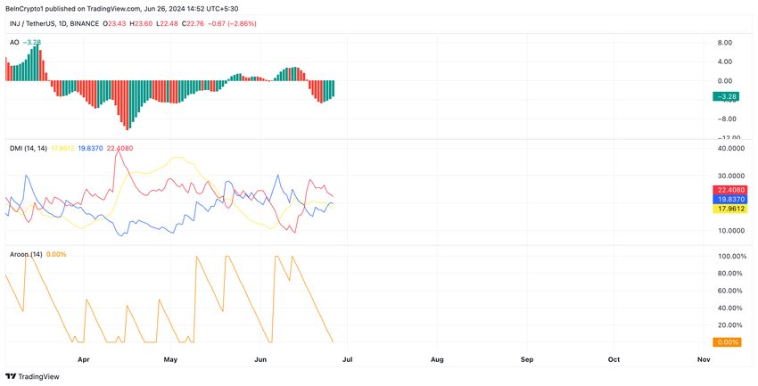 Mens prisen har klart en oppgang på 9% den siste uken, er INJs marked fortsatt dominert av bjørner. For eksempel bekrefter avlesninger fra Directional Movement Index (DMI) dette.