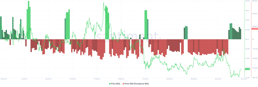 En vurdering av INJs Price-Daily Active Address (DAA) Divergence-beregning antyder at den nylige oppgangen i altcoins verdi kan være kortvarig.