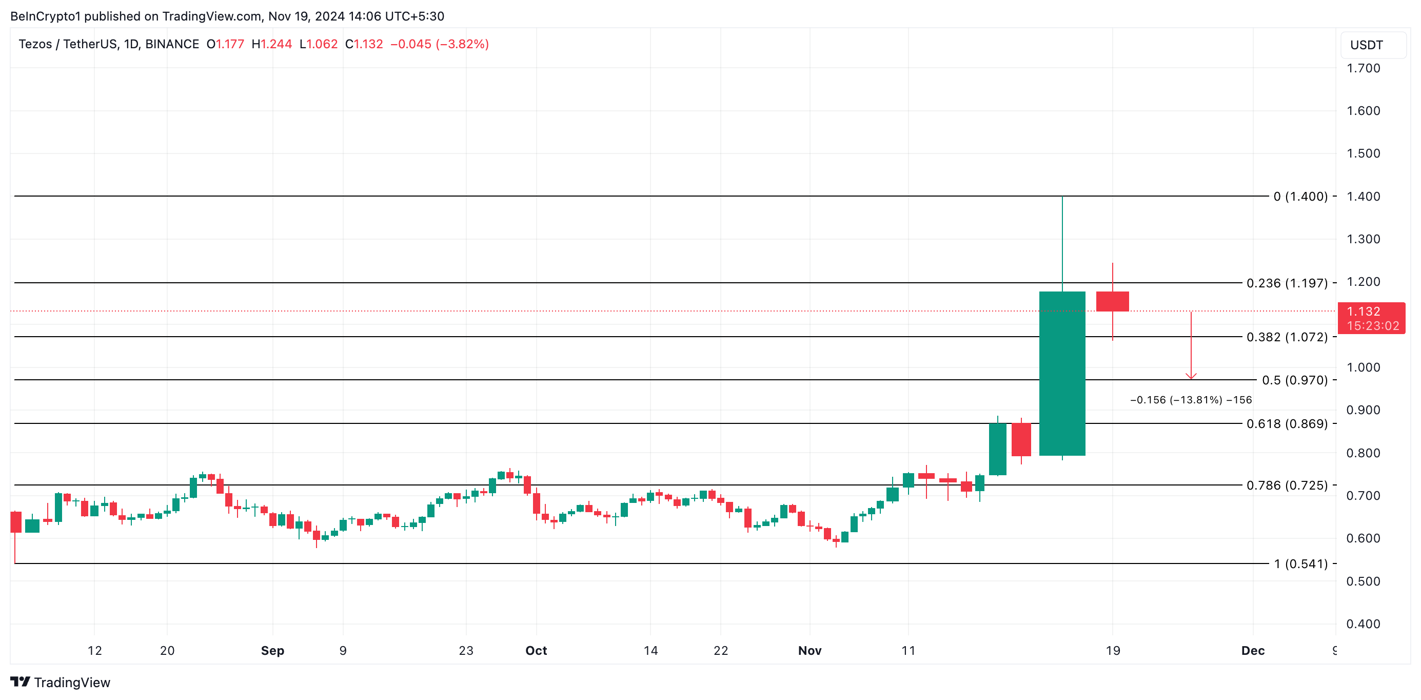 XTZ handles for øyeblikket til $ 1,13, og holder seg over støttenivået på $ 1,07. Hvis kjøpsmomentet svekkes, kan prisen falle til dette nøkkelstøttenivået. En manglende evne til å opprettholde $ 1,07 kan presse XTZ under $ 1, potensielt fallende til $ 0,97 — en nedgang på 14 % fra dens nåværende verdi.