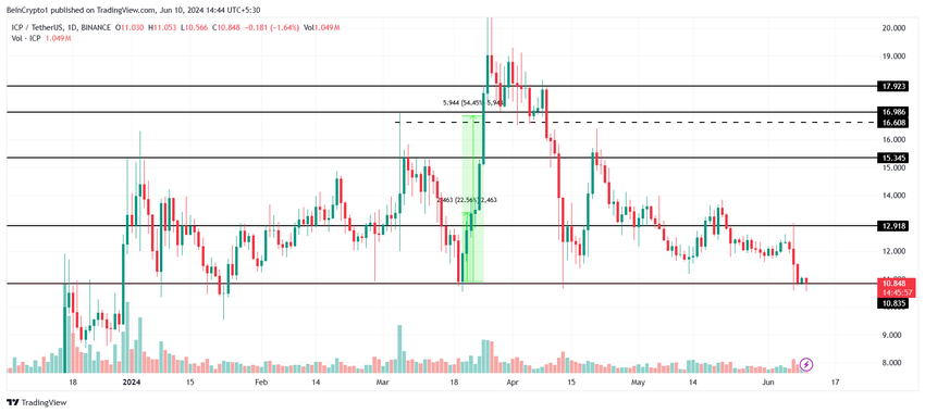 ICP-prishandel på $ 10.84 tester den kritiske støtten på $ 10.83. Dette støttegulvet har vært ubrutt siden januar i år til tross for fem forsøk. Dermed vil en dukkert under den markere et seks måneders lavpunkt for kryptoaktivaen.