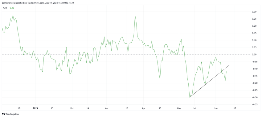 Chaikin Money Flow (CMF)-indikatoren viser denne endringen i sin nedtur under opptrendlinjen. CMF-indikatoren måler akkumuleringen og fordelingen av en eiendel over en spesifisert periode ved hjelp av både pris og volum for å måle kjøps- og salgspress.
