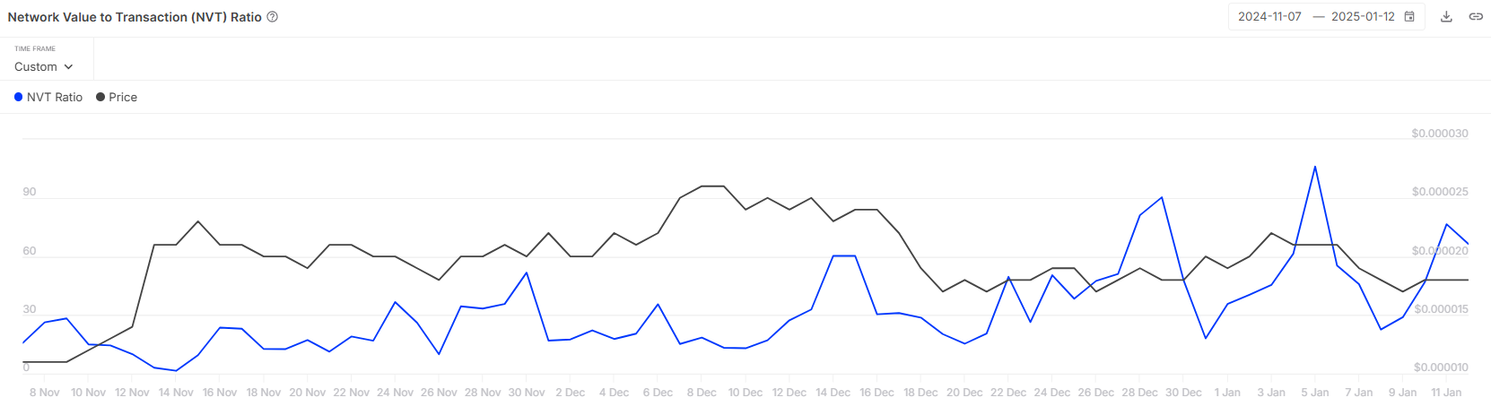 PEPEs makro-momentum påvirkes av dens Network Value to Transactions (NVT) Ratio, som nylig har økt. En stigende NVT Ratio reflekterer økt nettverksaktivitet i forhold til transaksjonsaktivitet, noe som ofte utløser korrigerende prisbevegelser. Denne trenden har bidratt til PEPEs kamp for å komme seg i en bredere bearish markedssituasjon.