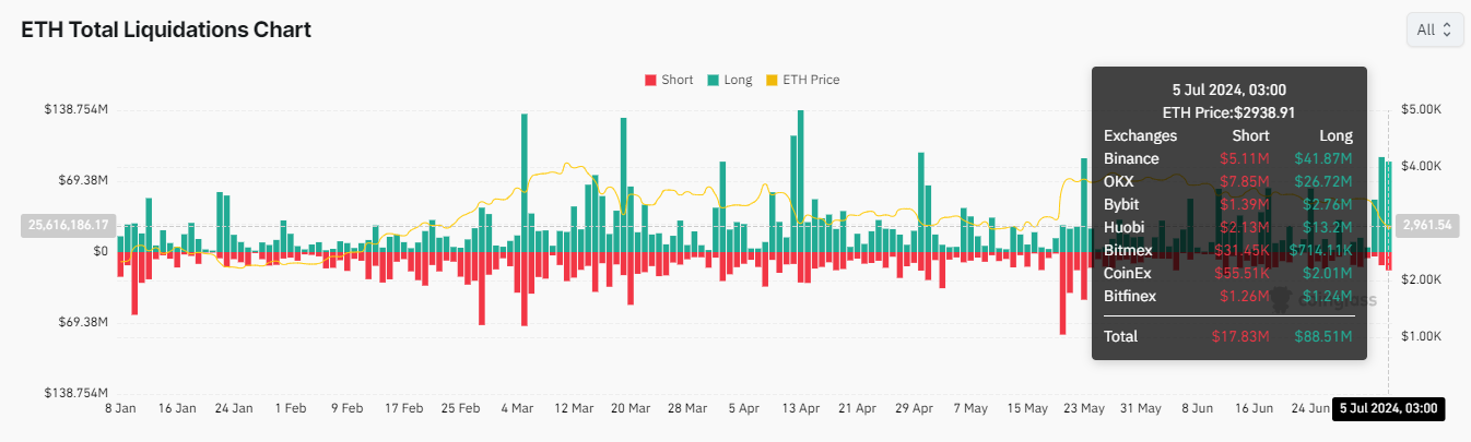 Om den tyske regjeringen vil ta opp Justin Sun på hans tilbud, er fortsatt ukjent. I mellomtiden fortsetter markedet å tåle bearish sentiment, med eksperter som rapporterer ekstrem frykt. I følge Coinglass skjedde over 104 millioner dollar i ETH-likvidasjoner de siste 24 timene.