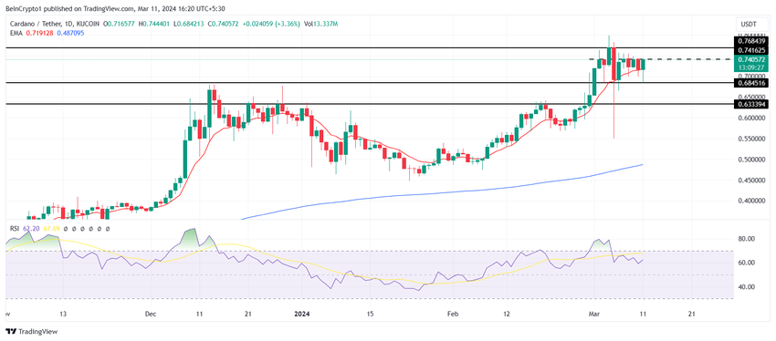 Cardanos pris har avtatt, og alt tyder på at en prisnedgang er sannsynlig. Altcoin har testet den lokale motstanden på $ 0.74 den siste uken og klarer fortsatt ikke å bryte gjennom.