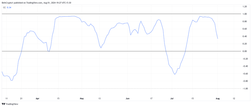 De siste syv dagene, mens Bitcoin sin pris falt under $ 65 000, klarte KAS å poste en økning på 16,5 %. En stor grunn til dette er den synkende korrelasjonen Kaspa deler med BTC. For øyeblikket på 0,33, resulterer en lav korrelasjon i at en token generelt ikke følger BTCs vei så tett som den ellers ville gjort.