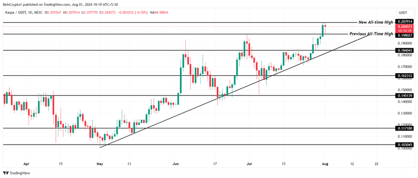 Dette er den tredje ATH dannet av Kaspas pris de siste tre månedene, takket være den pågående oppadgående trenden. Overbevisningen blant investorene har også vært betydelig høy, noe som er hvordan altcoinen klarte å motstå den bredere markedets bjørnetendens over den siste uken.