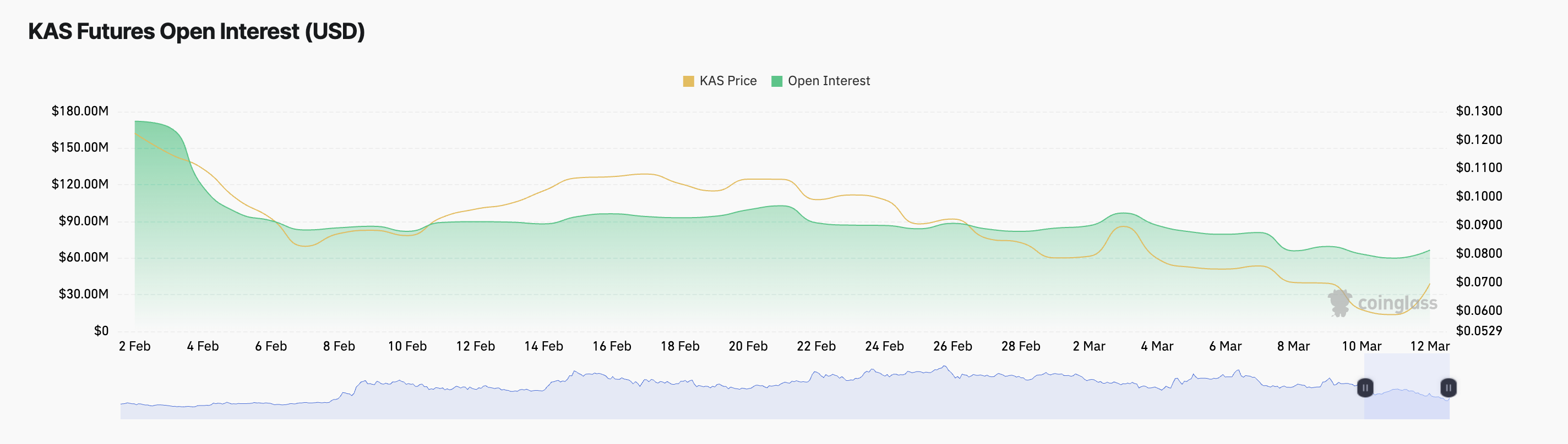 Åpen interesse refererer til det totale antallet utestående derivatkontrakter som ikke er oppgjort. Når den stiger, antyder det økt markedsdeltakelse og ny kapital som går inn i KAS-posisjoner. Dette signaliserer økende tillit til aktivets prisutvikling og antyder en vedvarende oppgang hvis det fortsetter.