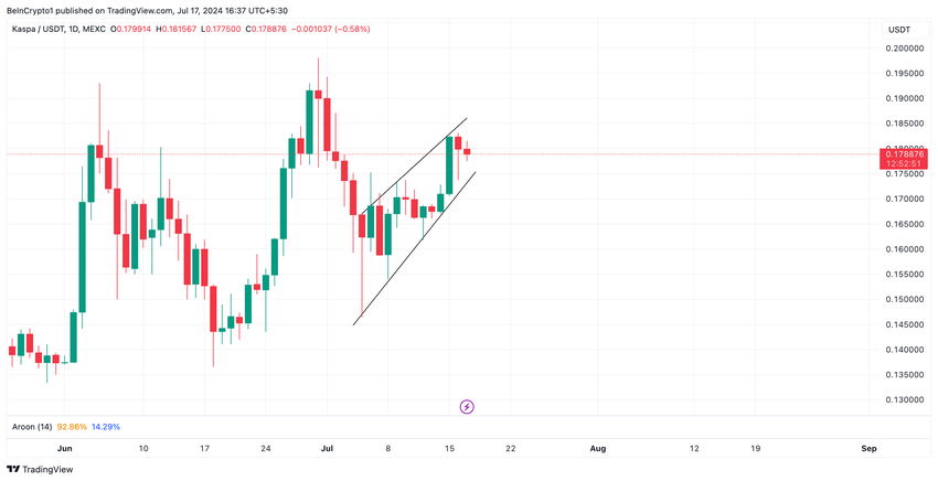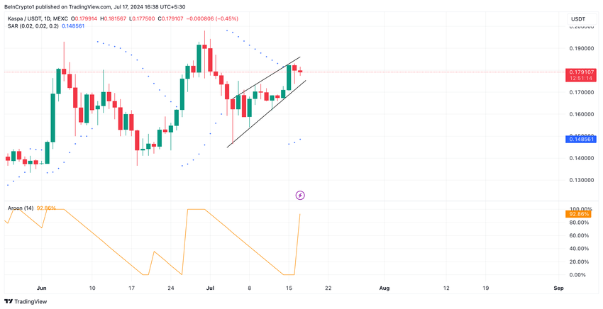 Aroon-indikatoren, vurdert på et endagsdiagram, bekrefter KAS’ oppadgående trendstyrke. Når dette skrives, er myntens Aroon Up Line en oppadgående trend på 92,86 %.