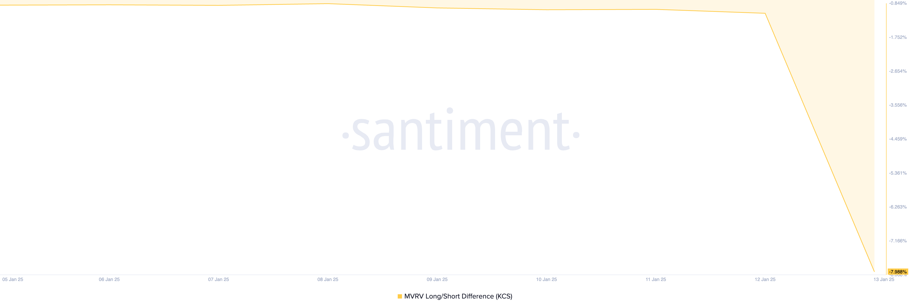 KCS har registrert en økning på 376 % i handelsvolumet de siste 24 timene, og presset prisen opp 3 % i løpet av denne perioden. På grunn av denne økningen er mange KCS STHs nå i pluss, noe som gjenspeiles av avlesningene fra dens MVRV Long/Short Difference. I skrivende stund ligger dette på en 30-dagers lav på -7,98 %.