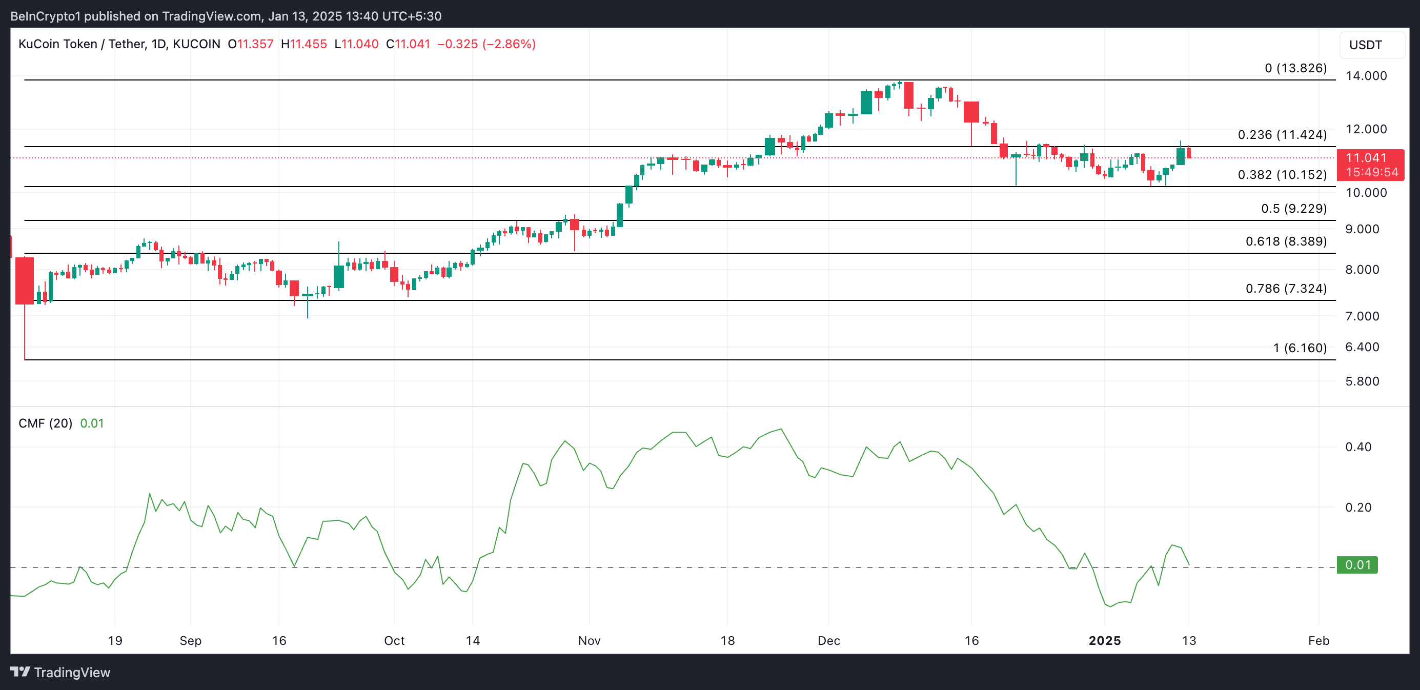 En vurdering av KCS/USD en-dags diagrammet viser den potensielle dannelsen av en bearish divergens mellom altcoinens pris og dens Chaikin Money Flow (CMF). På presstidspunktet er denne indikatoren i en nedadgående trend på 0,01 og er klar til å falle under null-linjen.