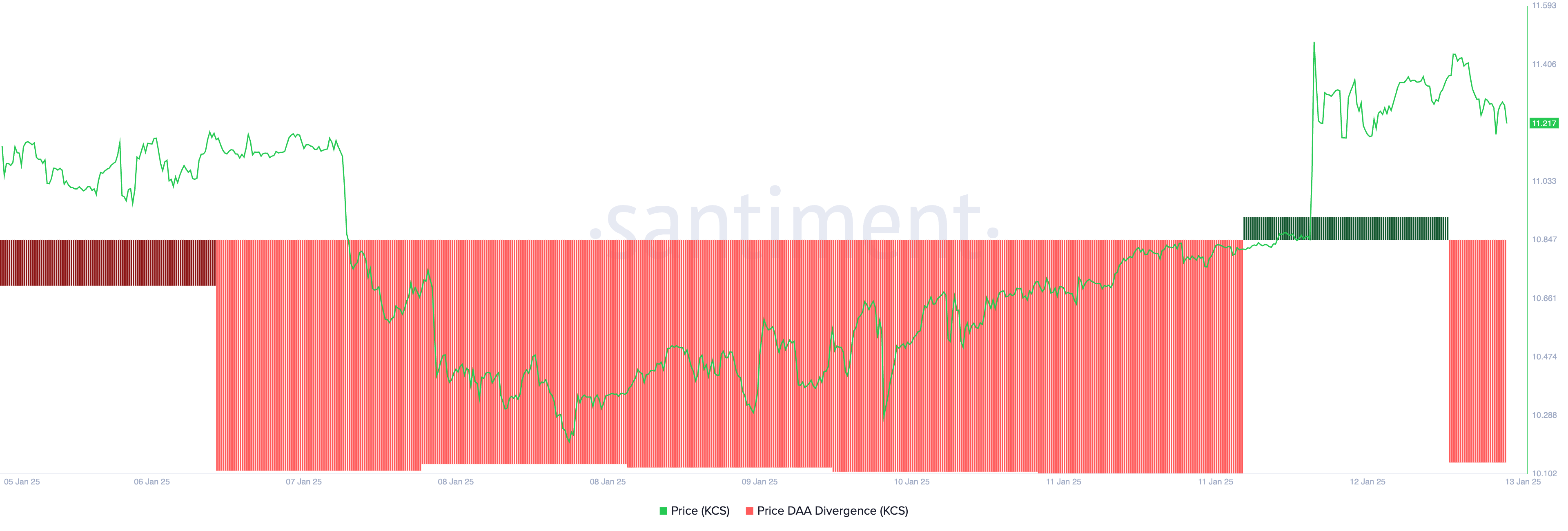 Videre, til tross for KCS sin prisøkning, har dens Price DAA (Daily Active Addresses) Divergence-indikator kun blinket salgssignaler i dag.