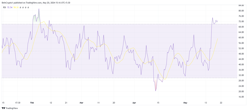 For øyeblikket er RSI over 70, noe som tyder på at LINK er overkjøpt på 12-timersdiagrammet. Dette skjedde sist i februar, og deretter tok rallyet en pause. Det samme kan bli skjebnen til Chainlinks pris også.