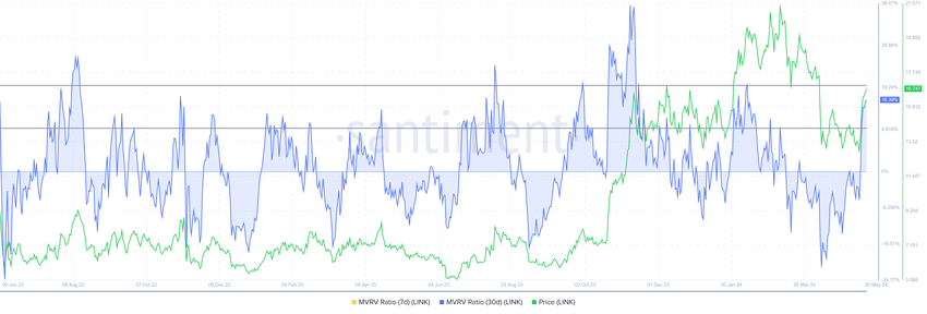 MVRV-forholdet sporer investorenes gevinster / tap. Chainlinks 30-dagers MVRV på 16 % tyder på fortjeneste, noe som kan føre til salg. Historisk sett har LINK en tendens til å korrigere på MVRV-nivåer på 10-20 %, noe som gjør dette til en risikosone.