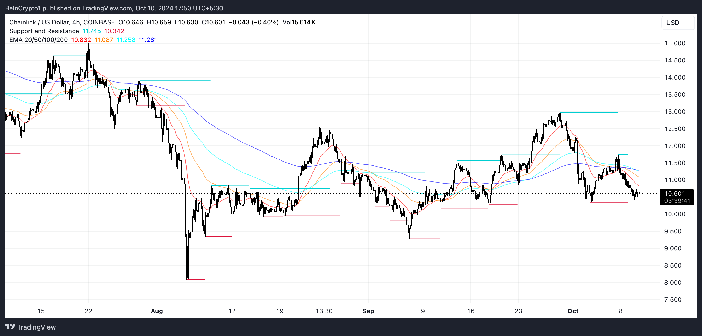 Hvis den nedadgående trenden fortsetter, vil LINK-prisen sannsynligvis teste støttenivåer rundt $9,9 og $9,3. Hvis disse støttene mislykkes, kan prisen falle så lavt som $8, noe som vil representere en potensiell nedgang på 23,8 %. På den annen side, hvis trenden snur, som den nesten gjorde nylig, kan LINKs pris stige tilbake til $11,7. Skulle den motstanden brytes, vil neste mål være rundt $13, noe som representerer en potensiell gevinst på 23 %.