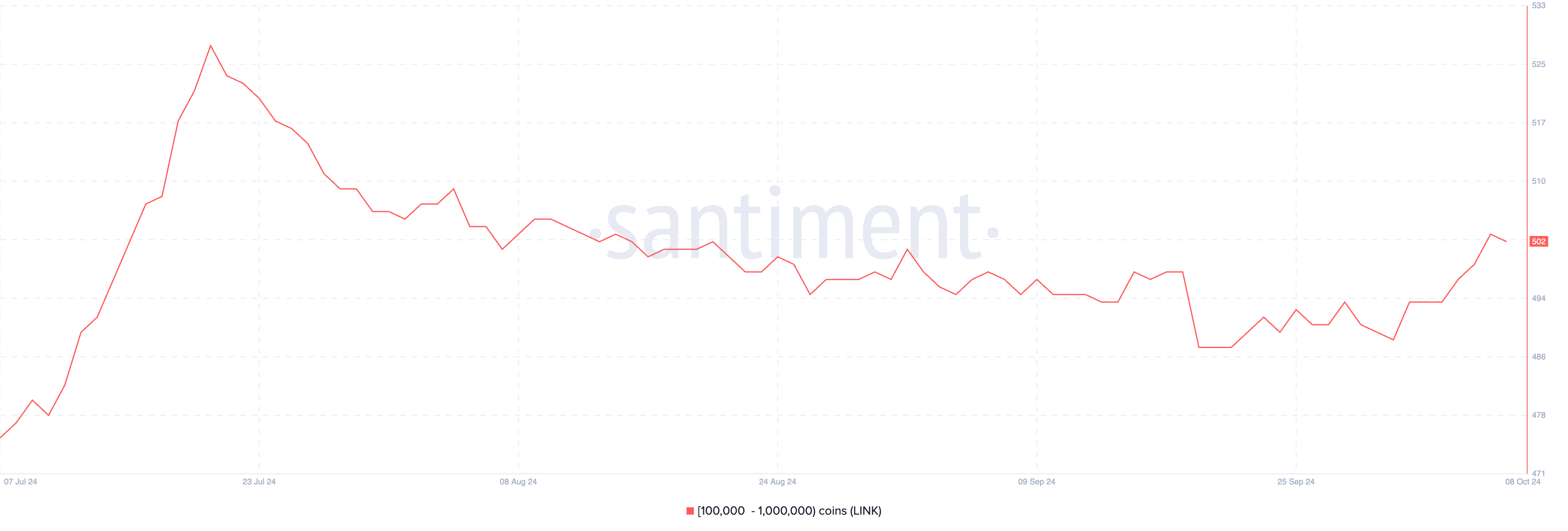 Brukere som har mellom 100 000 og 1 000 000 LINK-tokens ser ut til å komme seg etter den nylige korreksjonen. Å spore disse hvalene er avgjørende fordi de ofte påvirker markedsretningen betydelig. Hvaler har makt til å påvirke prisene på grunn av de store volumene de kontrollerer, noe som gjør deres oppførsel til en nøkkelindikator på markedssentimentet.