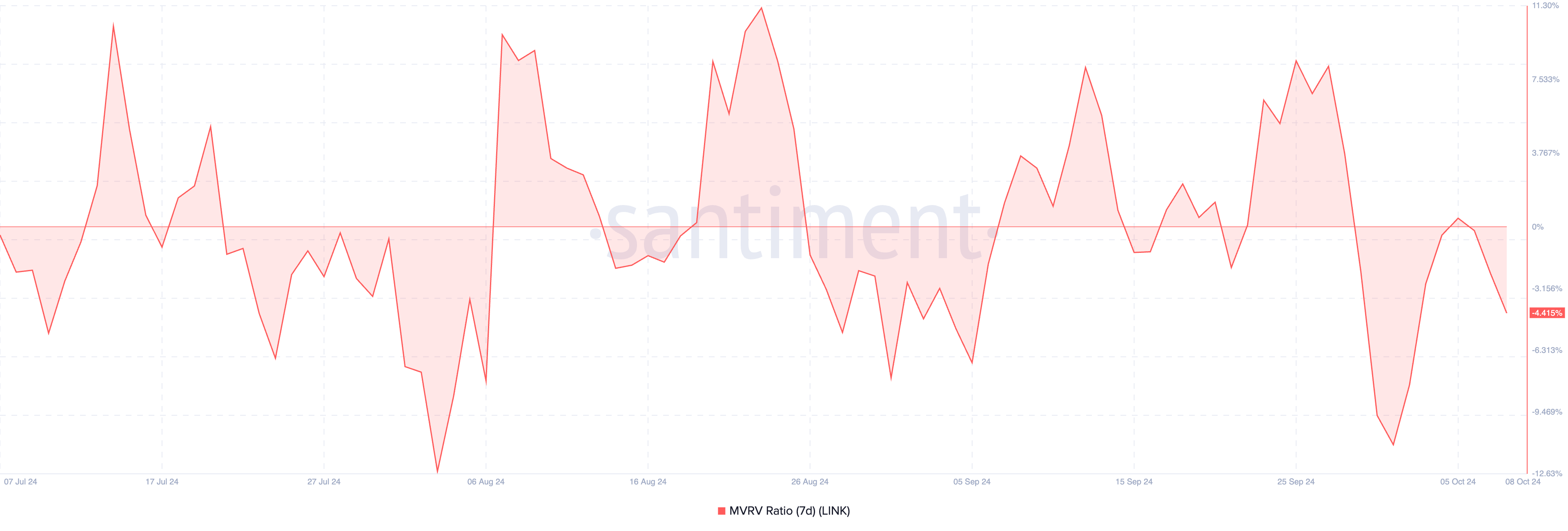 LINK 7-dagers MVRV-forholdet er for tiden på -4,41 %, ned fra 8,12 % 27. Denne nedgangen er viktig fordi MVRV-forholdet bidrar til å måle markedssentimentet og potensielle prisbevegelser. Et synkende MVRV-forhold indikerer at flere innehavere nå går med tap, noe som kan endre investoratferd.