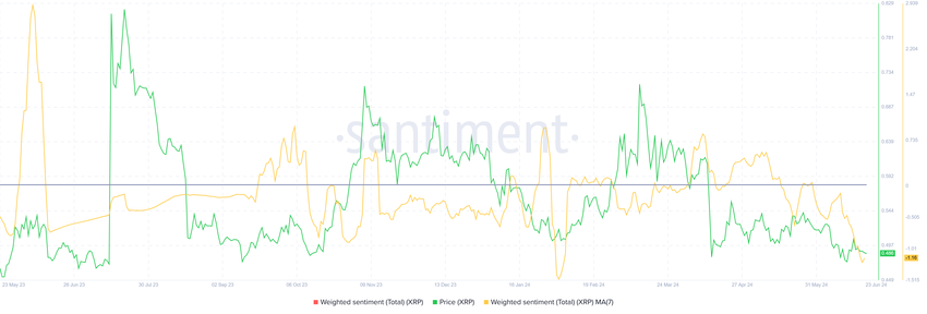 XRP-prisen kan stå overfor hovedtyngden av bjørnene eller det skiftende sentimentet til investorene. Pessimismen blant XRP-investorer stiger raskt, noe som gjenspeiles av nedgangen i vektet sentiment.