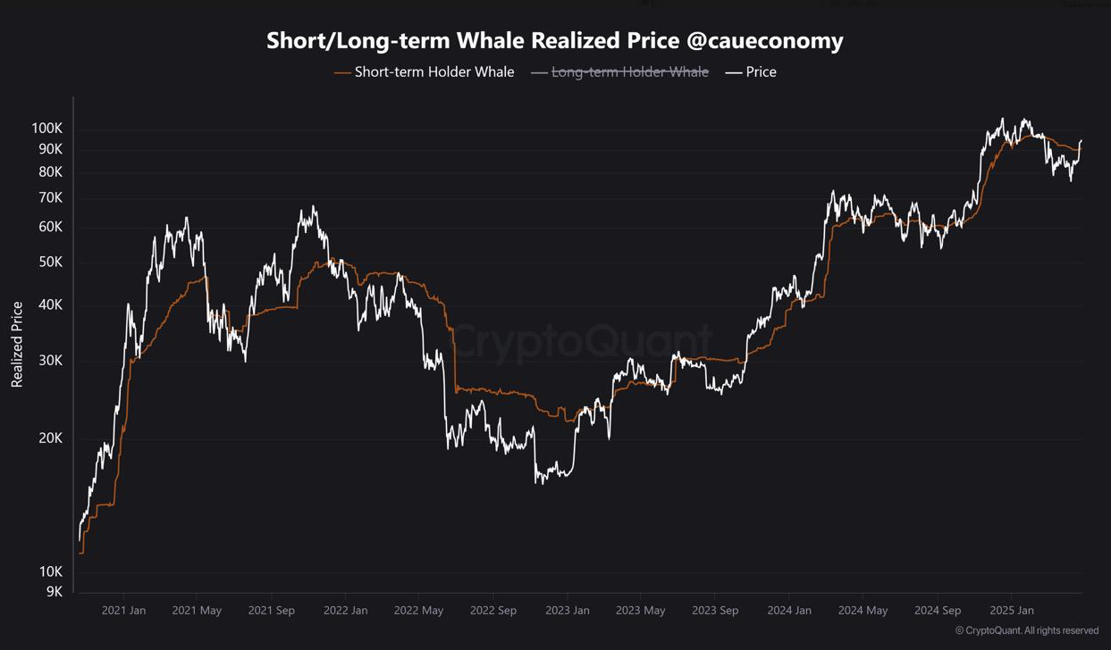 CryptoQuants Short/Long-Term Whale Realized Price-diagram viser den oransje linjen (kortsiktig hval kostnadsgrunnlag) stige mot den hvite markedspriskurven de siste ukene.