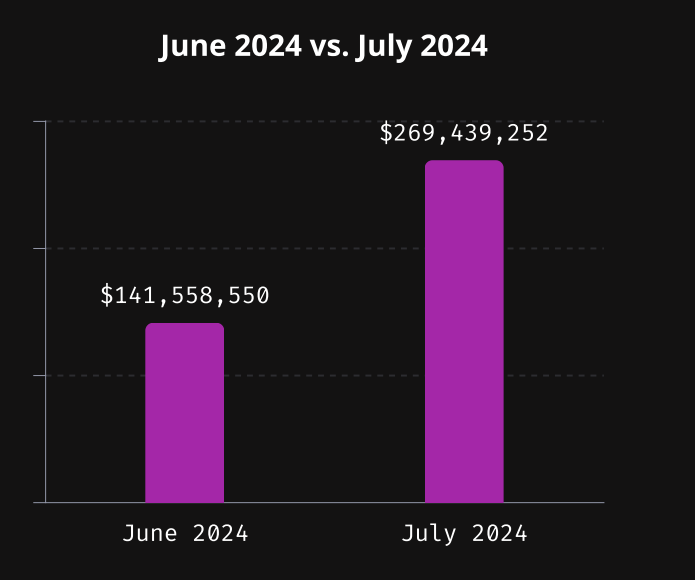 I juli rapporterte Immunefi at kryptosektoren led tap på $269,4 millioner i 14 separate hendelser. Dette reflekterer en økning på 90 % fra juni, noe som gjør juli til den nest mest skadelige måneden i 2024. De mest betydelige tapene var i mai, da de nådde $358 millioner.