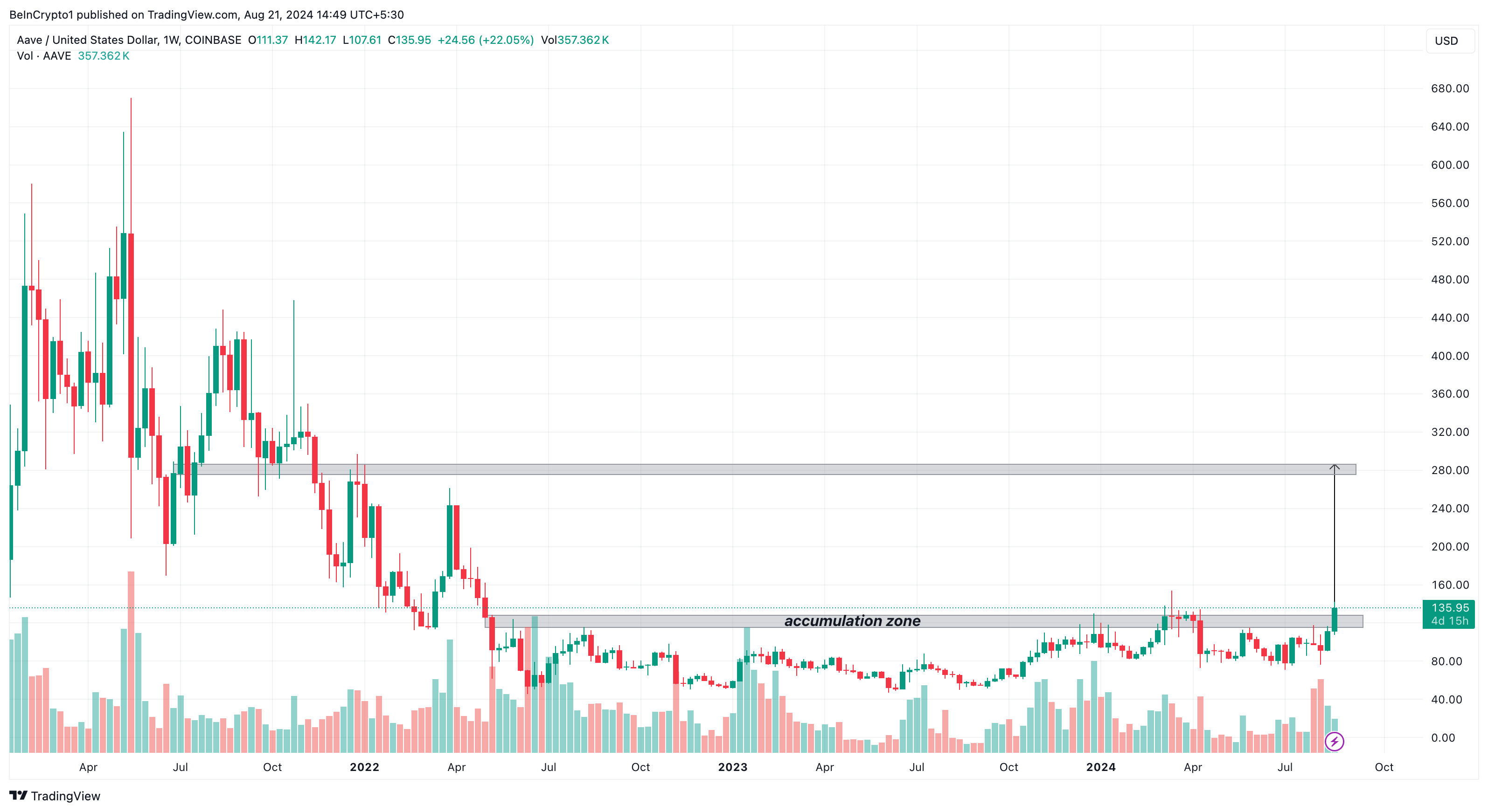 AAVE har brutt over et toårig akkumuleringsområde mellom $ 112 og $ 130, som vist på bildet nedenfor. Siden 2022 har tokenen slitt med å bryte forbi dette området med suksess.