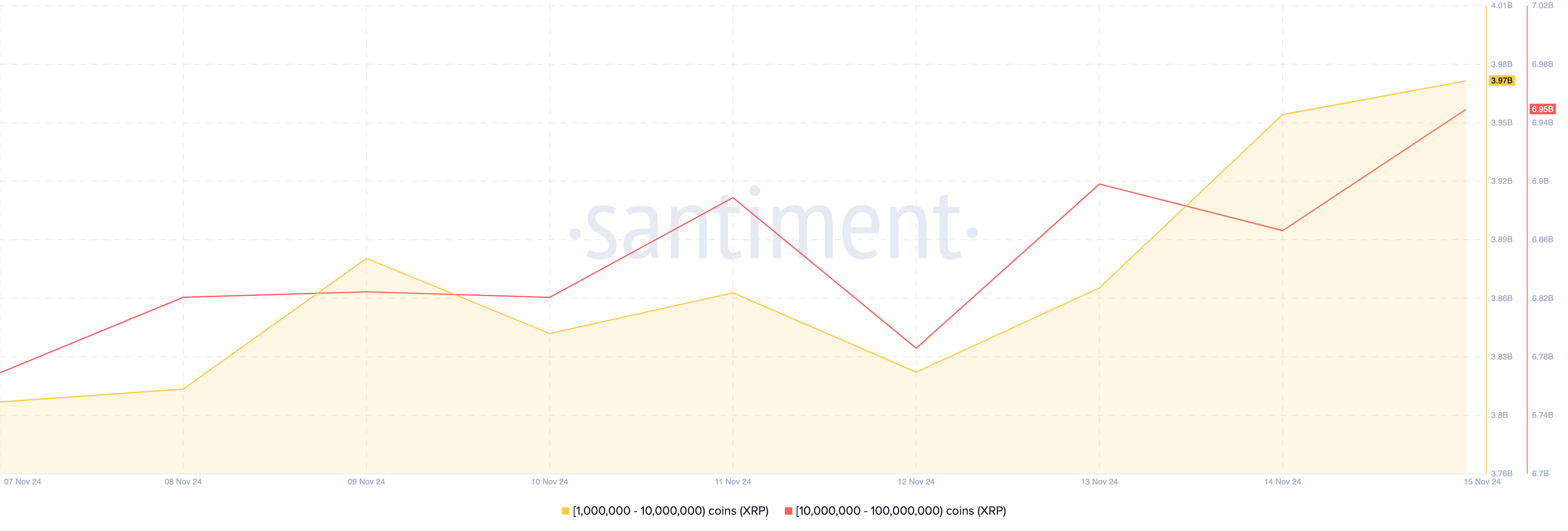 For eksempel, den 12. november hadde XRP som ble holdt av 1 million til 10 millioner kohorten 3,82 milliarder. På samme dag hadde 10 millioner til 100 millioner kohorten omtrent 6,79 milliarder XRP. Men i skrivende stund har tallene klatret til 3,97 milliarder og 6,95 milliarder, henholdsvis. Dette betyr at krypto hvaler kjøpte en kombinert 310 millioner tokens, verdsatt til rundt $ 267 millioner.