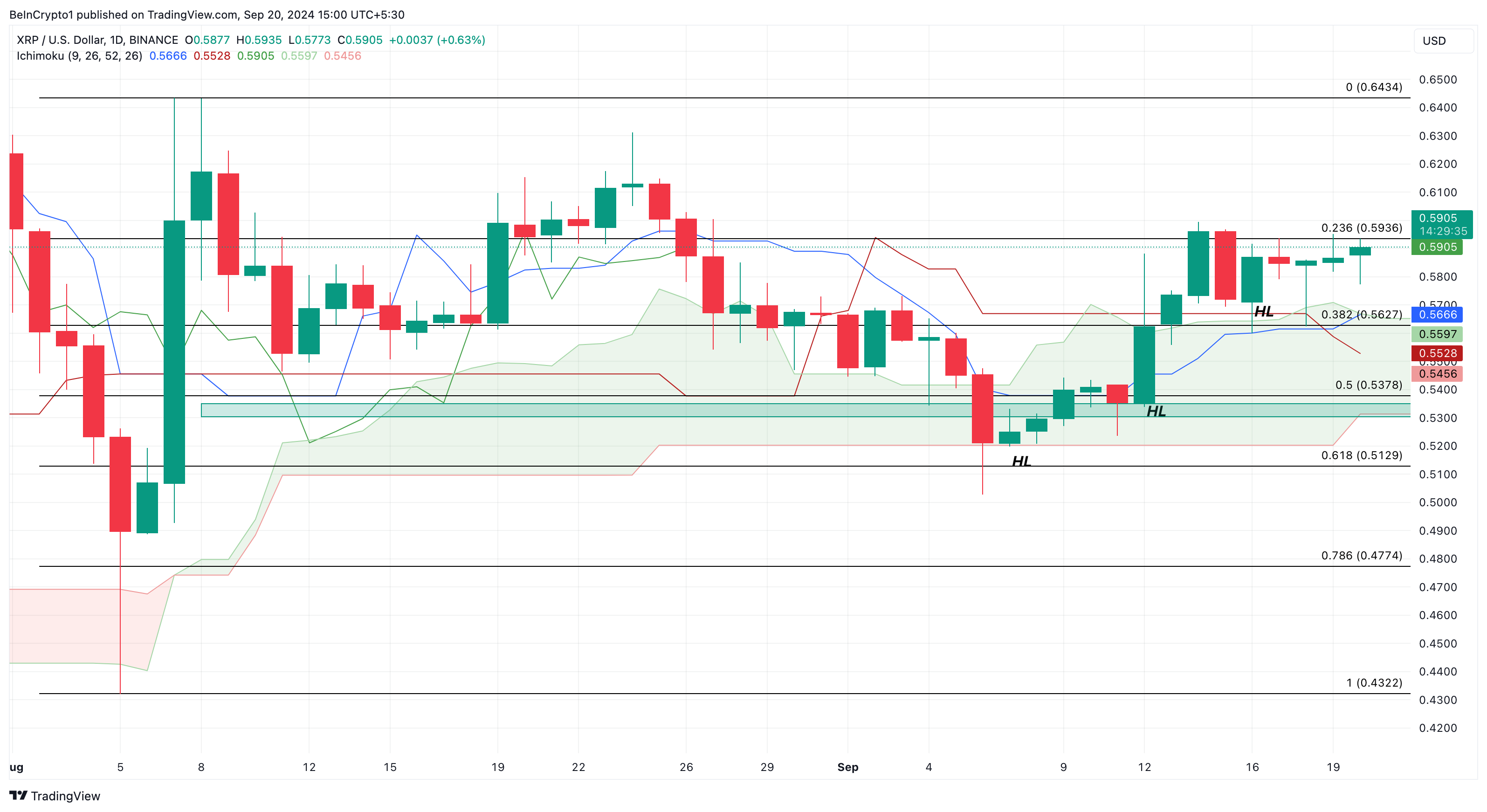 For øyeblikket forsvarer oksene støttenivået på $ 0.53, og XRP har steget over Ichimoku-skyen, en nøkkelteknisk indikator for kjøps- eller salgssignaler. Når prisen er under skyen, antyder det salgspress, mens en pris over skyen signaliserer en bullish trend.