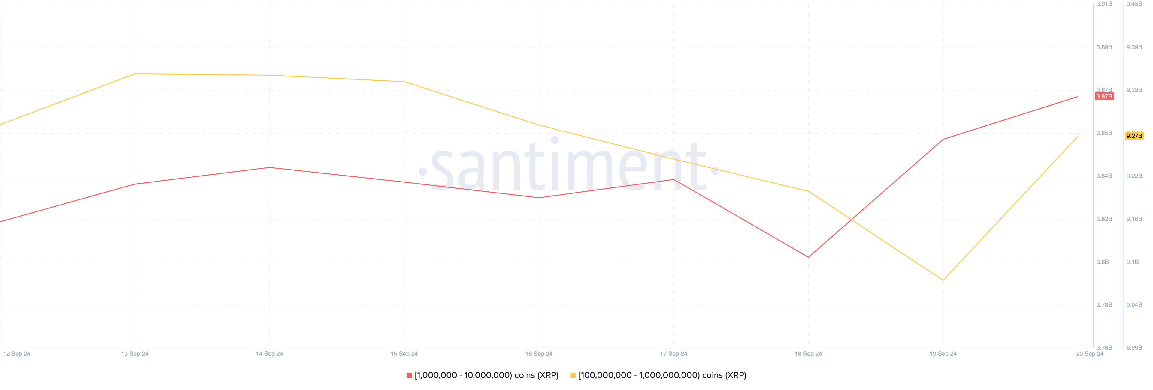 Ifølge Santiment har lommebøker som holder mellom 1 million og 10 millioner XRP kjøpt 40 millioner tokens denne uken. Samtidig har de som holder 10 millioner til 100 millioner akkumulert 270 millioner XRP.