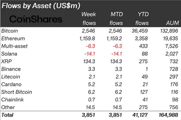 Bitcoin (BTC) ledet an, og sto for $ 2,5 milliarder av forrige ukes innganger. Dette bringer dens YTD-total til svimlende $ 36,5 milliarder. Den vedvarende bullish momentum har investorer som spår ytterligere gevinster, med noen analytikere som ser $ 100 000 som et oppnåelig mål i denne syklusen.