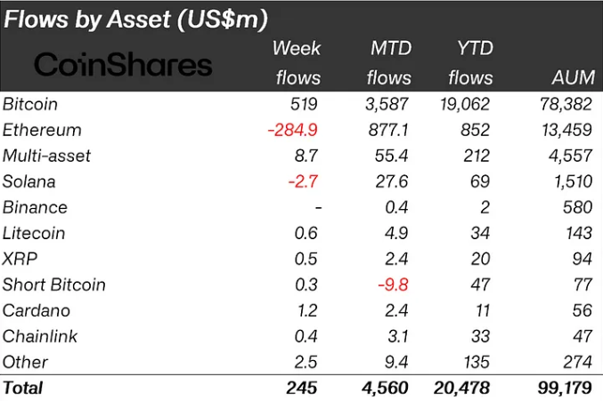 Ukentlige krypto investeringer var “relativt dempet” forrige uke, og registrerte kun $ 245 millioner da Ethereum led mest av Grayscale salget.