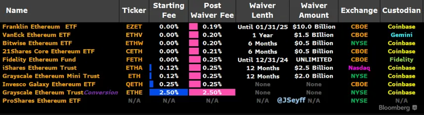 Med ETH ETF-er nå live, dumper Grayscale kunder sine beholdninger, akkurat som de gjorde da Bitcoin ETF-er debuterte. Salget kommer ettersom Grayscale tar en avgift på 2,5 % på sin ETHE ETF, den høyeste avgiften i markedet. Merkbart, avgifter kan betydelig påvirke ytelsen på lang sikt, ettersom avgifter vokser proporsjonalt med markedsvekst.