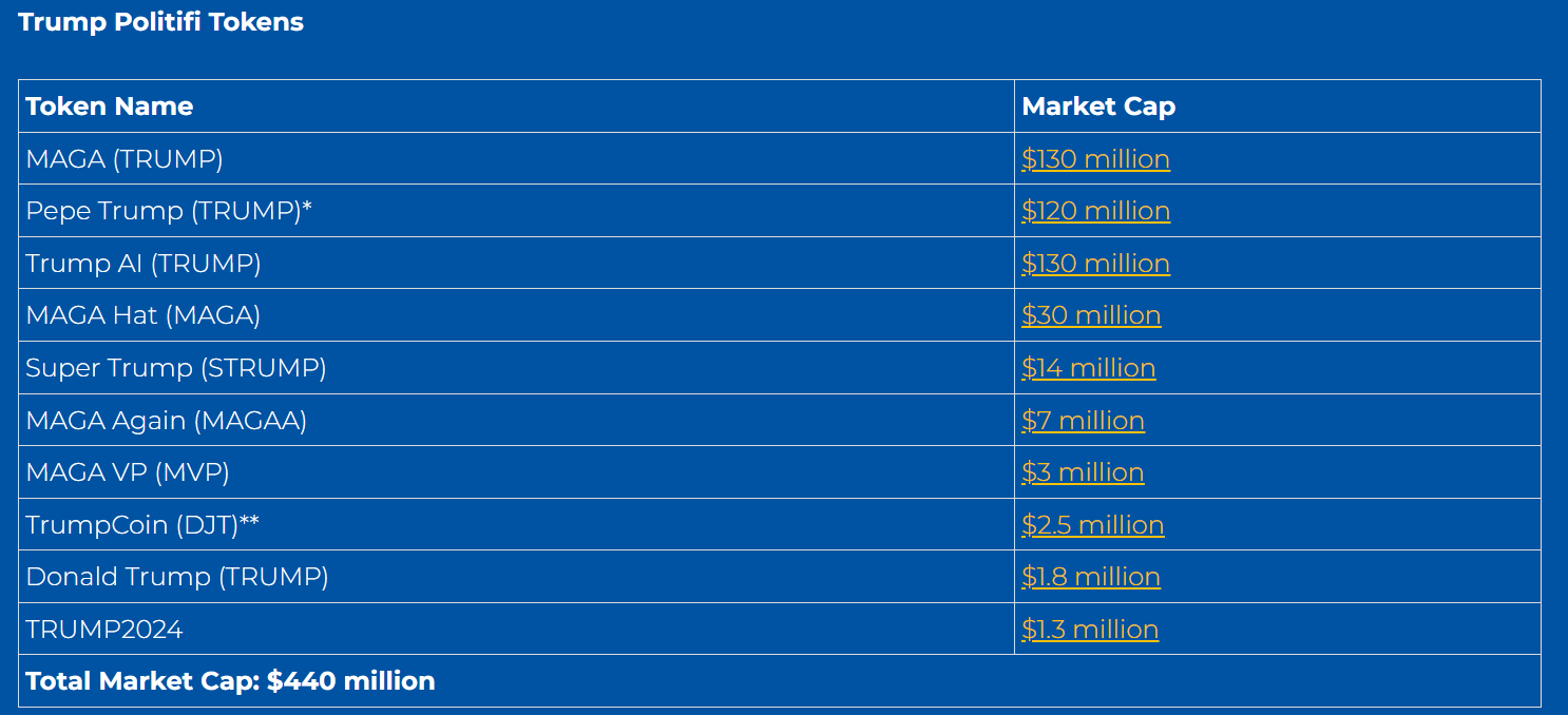 Politiske tokens, eller meme coins inspirert av politiske figurer, har overgått en markedsverdi på $ 440 millioner. Imidlertid er disse tokensene svært volatile og utsatt for svindel.