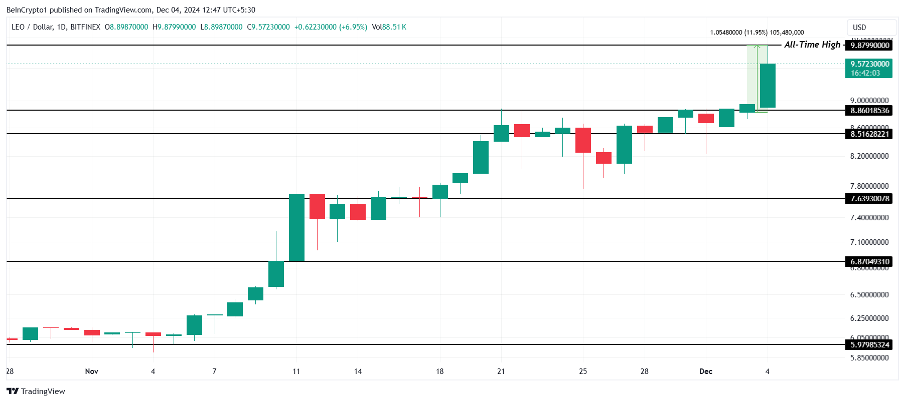 LEO token nådde nylig en ny all-time high (ATH) på $ 9,87 etter en nær 12 % økning de siste 24 timene. Dette markerer den andre ATH for LEO den siste måneden, noe som indikerer sterk markedsetterspørsel og bullish momentum. Tokenets ytelse har tiltrukket seg betydelig oppmerksomhet fra investorer.