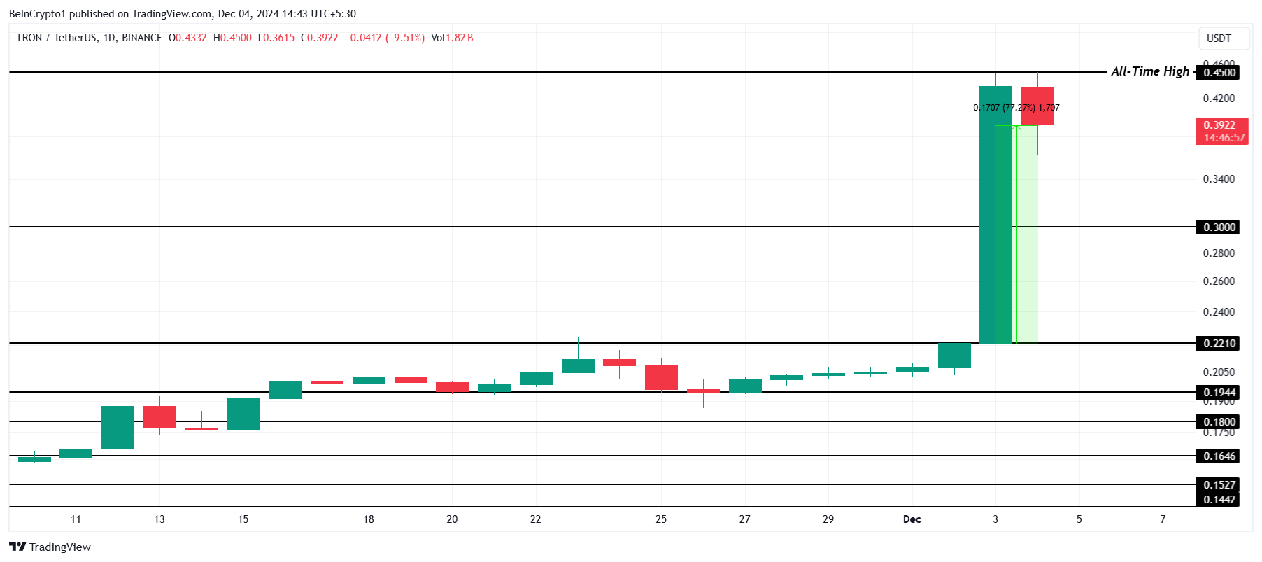 Trons kurs steg med 77 % de siste 24 timene, og nådde $ 0,39. Til tross for en intra-dagsnedgang på 9,5 %, forventes det at altcoinen vil opprettholde støtte over $ 0,30.