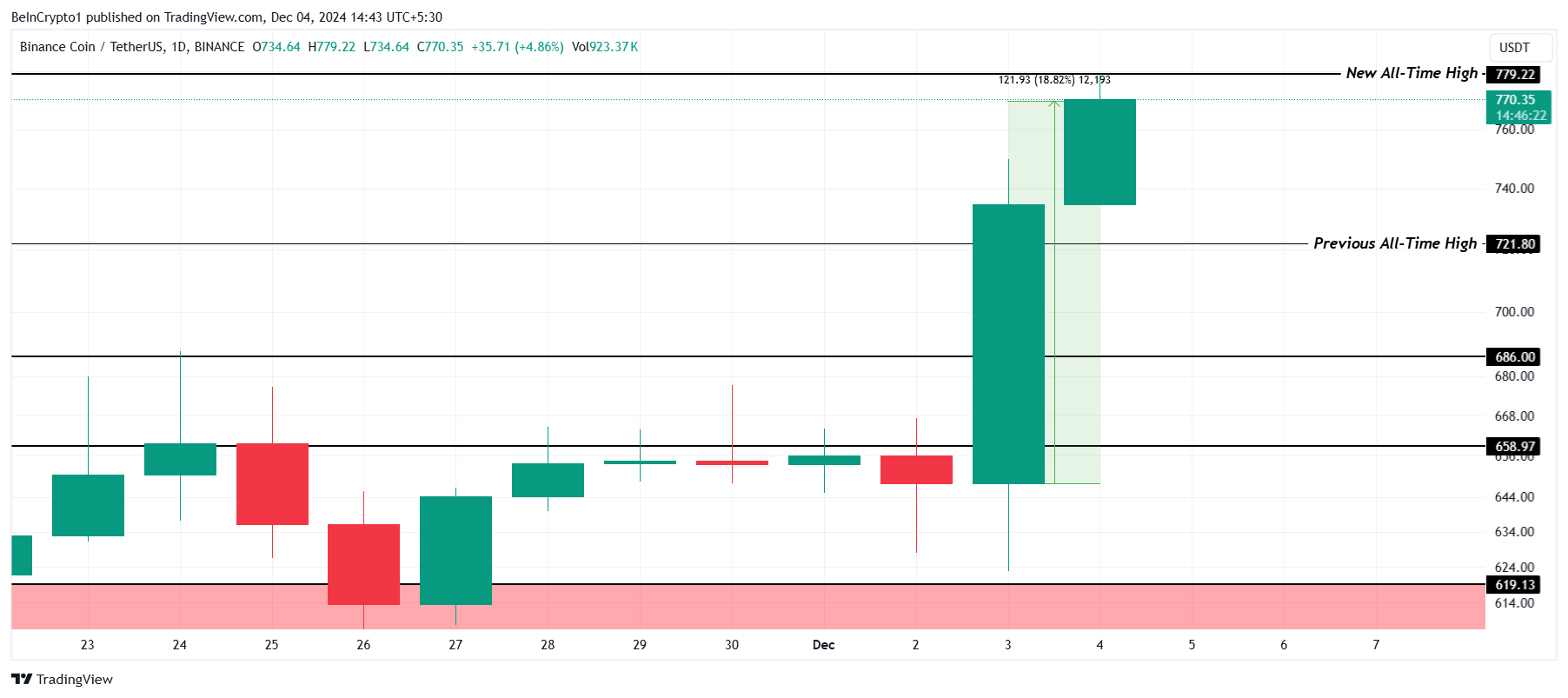 BNB kurs steg med 18 % de siste 24 timene, og nådde $ 770 i skrivende stund. Dagens høyeste på $ 779 satte en ny all-time high (ATH) for altcoinen. Denne prisbevegelsen fremhever sterk bullish momentum og økende markedsforventninger til BNBs fremtidige ytelse.