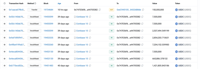 For eksempel mottok lommeboken 0xeC9 midler fra en annen lommebok, 0x747, før den sendte 150 millioner USDC til Coinbase. Interessant nok ble 0x747 selv etterfylt med USDC fra Coinbase rundt midten av mars da markedet nådde toppen.