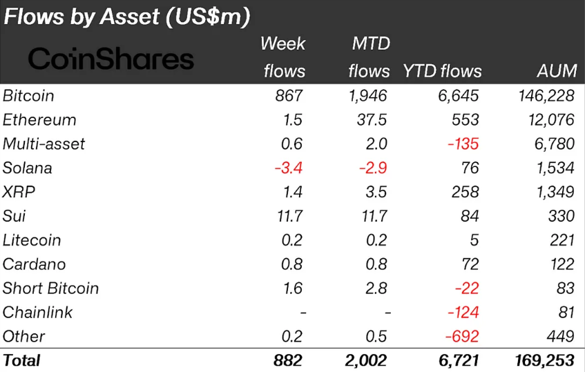 Digitale aktivainvesteringsprodukter opplevde en økning i institusjonell interesse forrige uke, med en økning på $ 882 millioner i kryptoinnstrømning globalt.