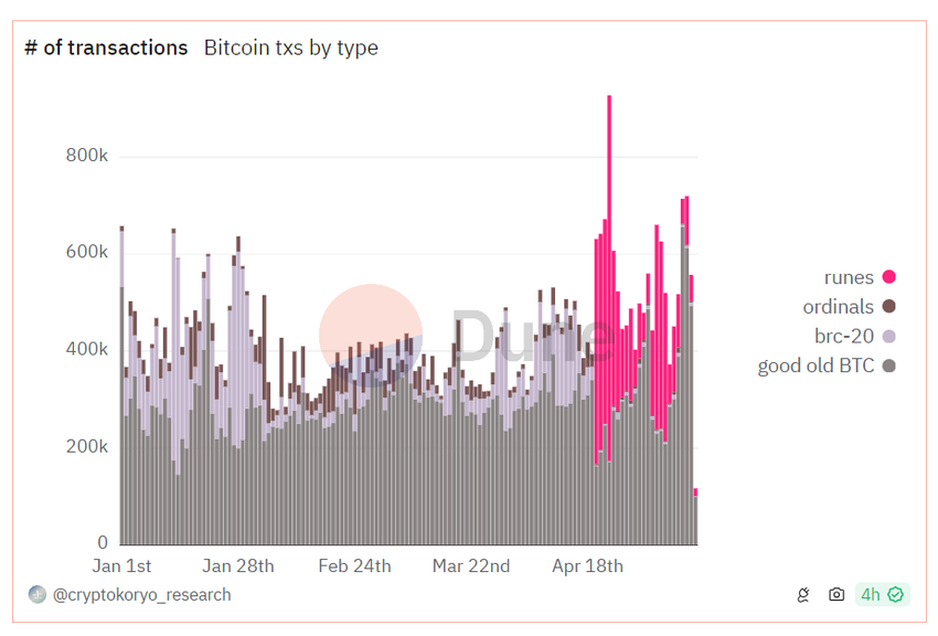 Runes-hypen avkjølte seg imidlertid kort tid etter at Bitcoin-halveringen skjedde. Dune Analytics-data viser et betydelig fall i Runes-transaksjoner. De falt med nesten 4,590%, fra 753,814 24. april til 16,066 13. mai.