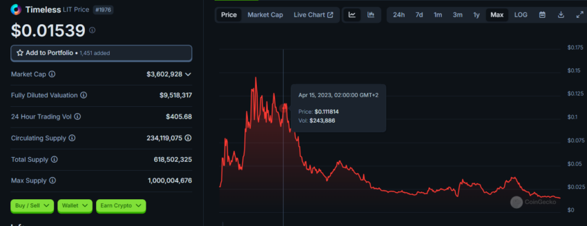 Kjøpsdatoen reiste imidlertid spørsmål blant kryptosamfunnet siden det var nær PEPEs lanseringstid. Videre avslørte data på kjeden på samme dato at den næringsdrivende byttet 20,000 Timeless (LIT) tokens, til en verdi av omtrent $ 2,256, for å kjøpe 3.4 milliarder PEPE.