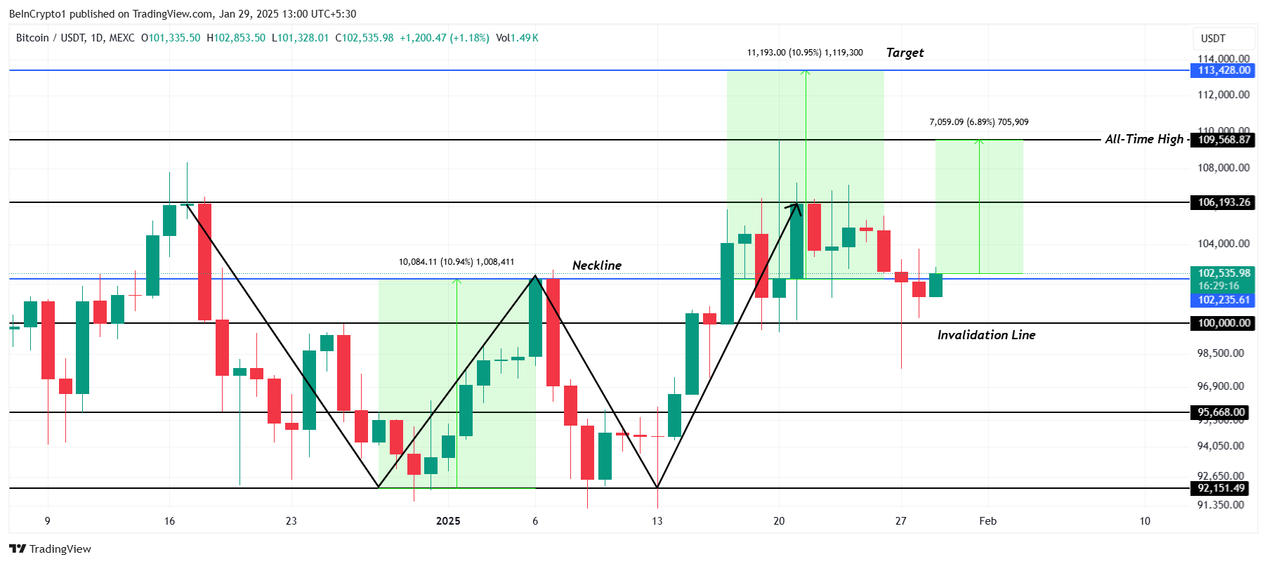 I skrivende stund, handles BTC til $102 535, og forsøker å etablere $102 235 som støtte. Kryptovalutaen holder knapt over $100 000, som fungerer som den kritiske ugyldighetslinjen. Et fall under dette nivået kan utløse økt salgspress, potensielt sende Bitcoin ned til $95 668.