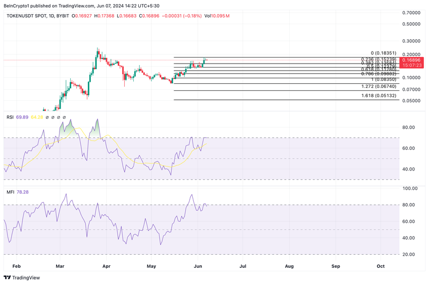 Money Flow Index (MFI) lå på 76,44, og fulgte en lignende bane. RSI og MFI er momentumindikatorer som tradere bruker for å måle et aktivums prismomentum og identifisere potensielle kjøps- og salgsmuligheter. Med disse verdiene viste disse indikatorene at kjøpspresset på TOKEN var betydelig.