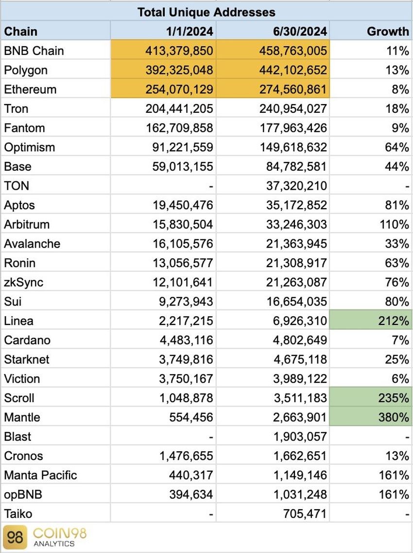 Andre bemerkelsesverdige omtaler på beregninger av antall unike adresser inkluderer Mantle, Scroll og Linea, som registrerte henholdsvis over 380%, 235% og 212% økninger.